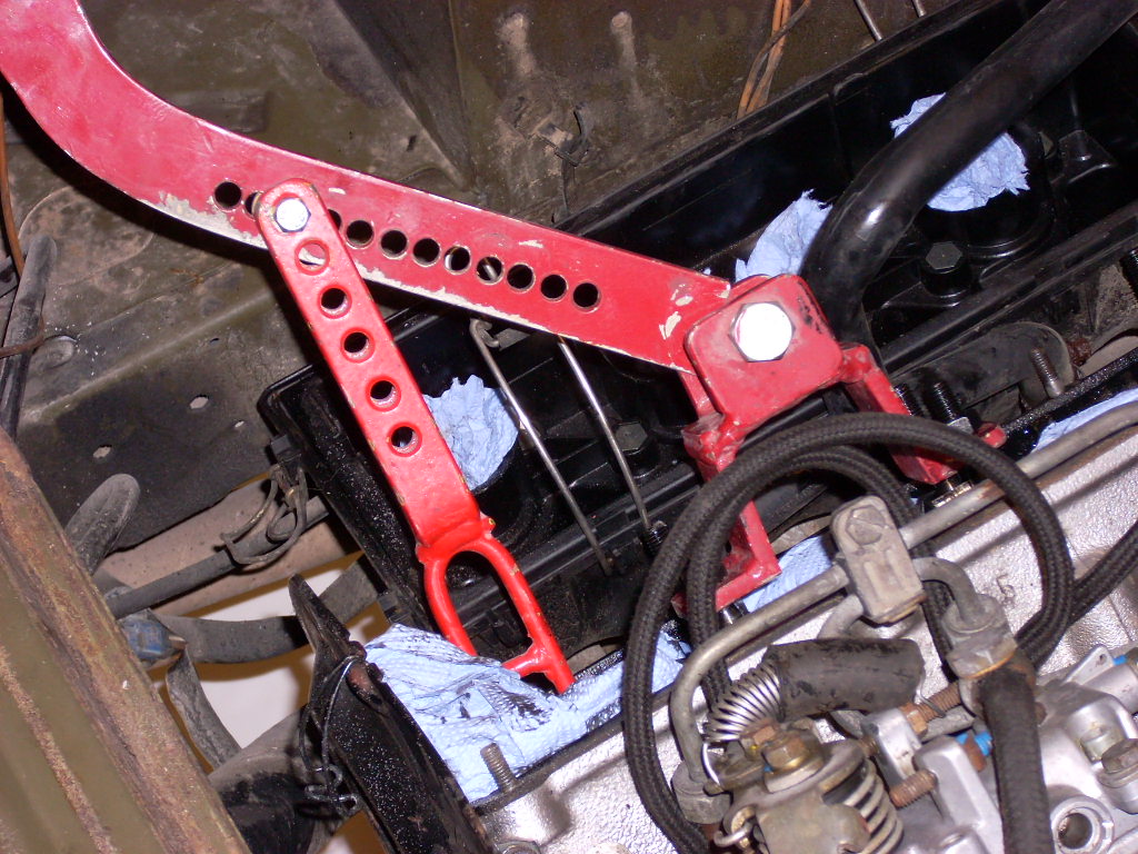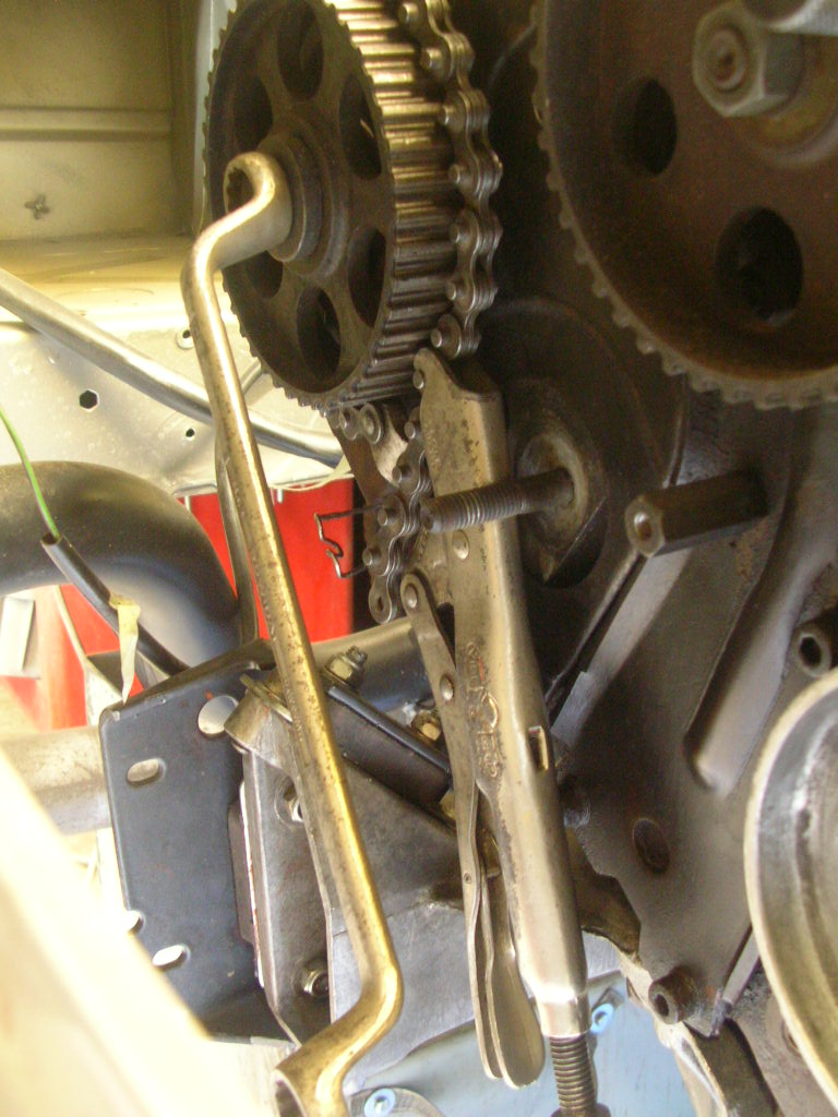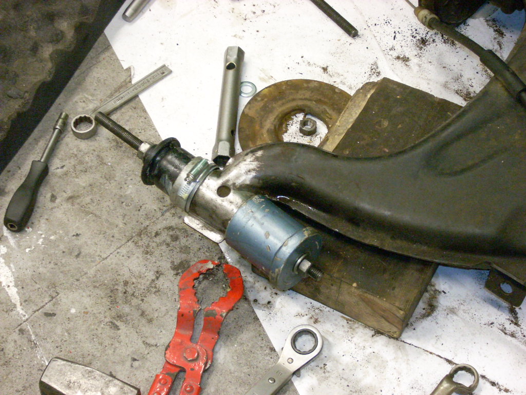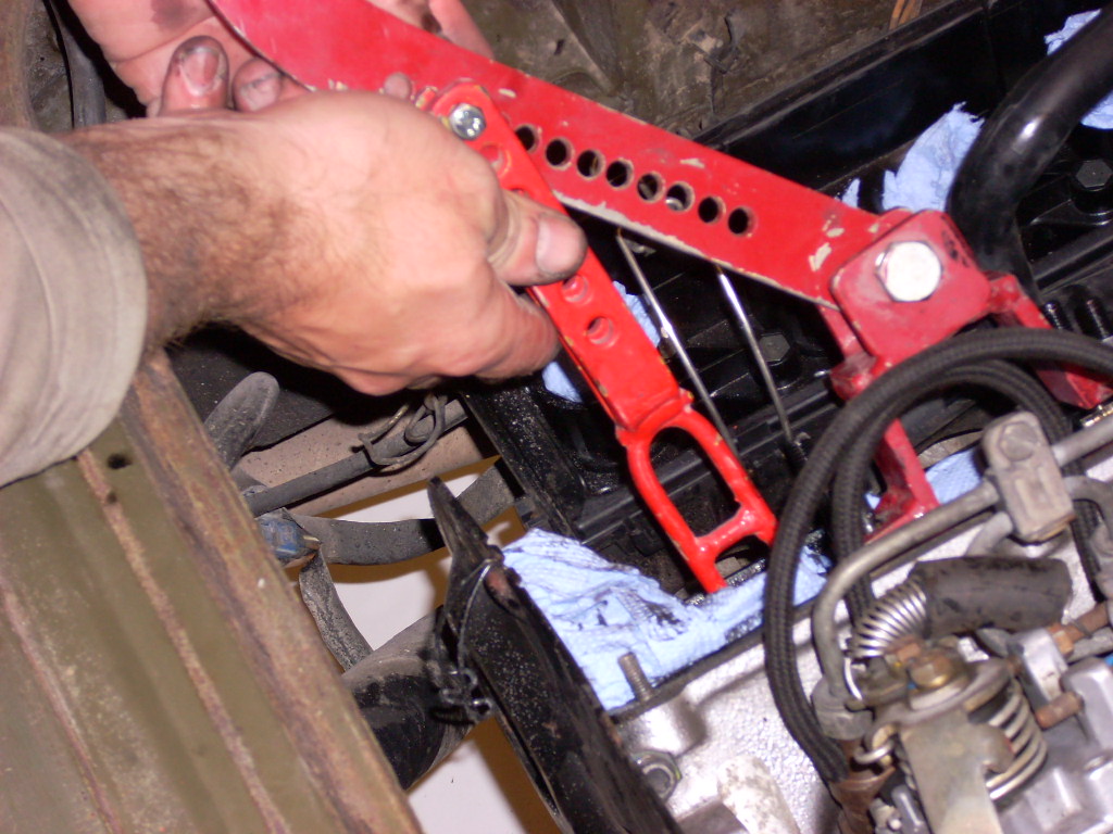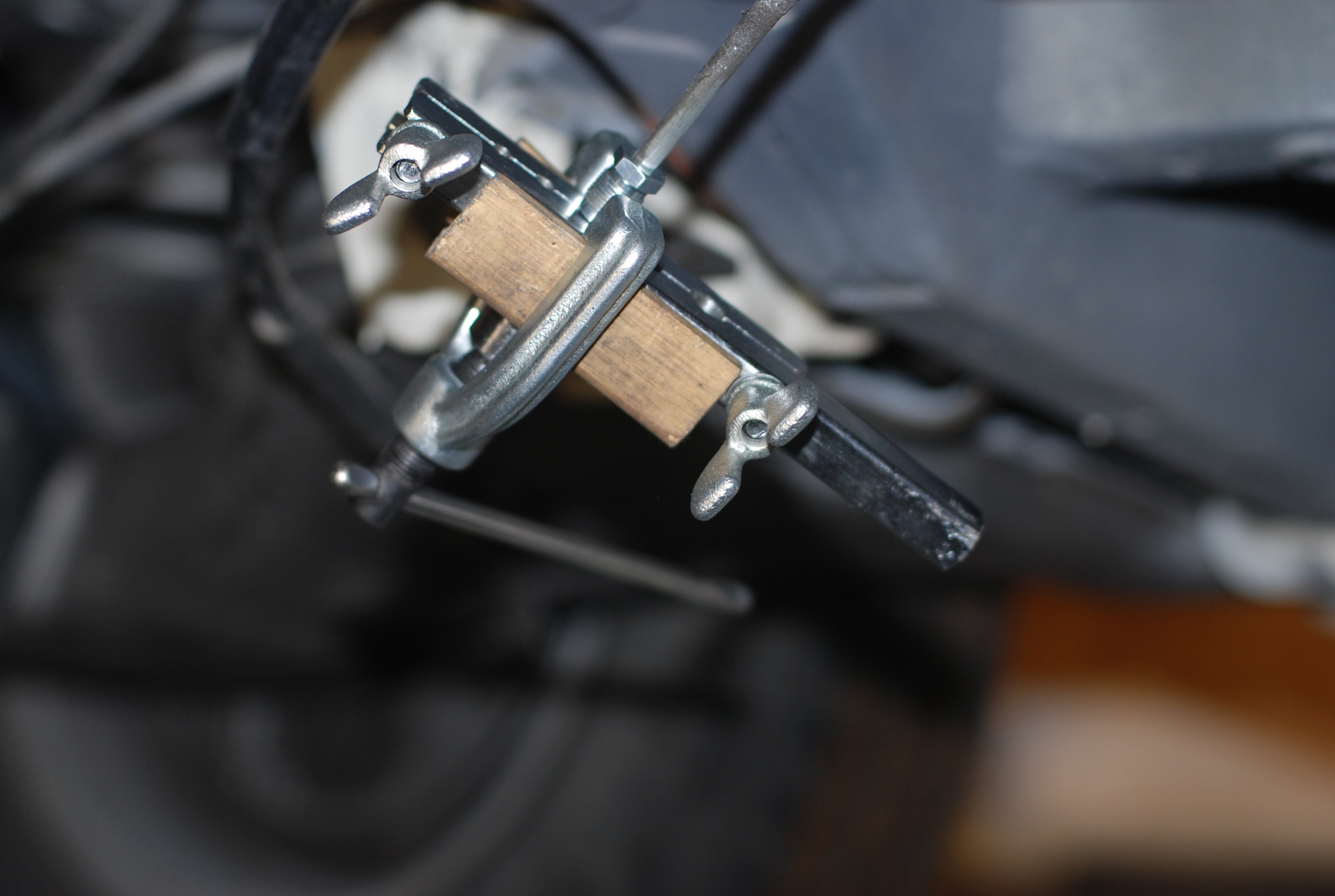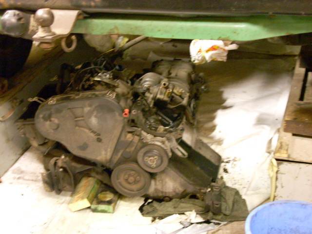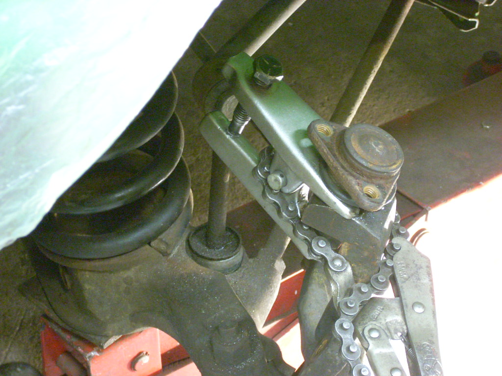 Zicht op de KY motor,welke hij met mijn verlengde krik liet zakken.Terug in zal de giraffe het werk wel doen.