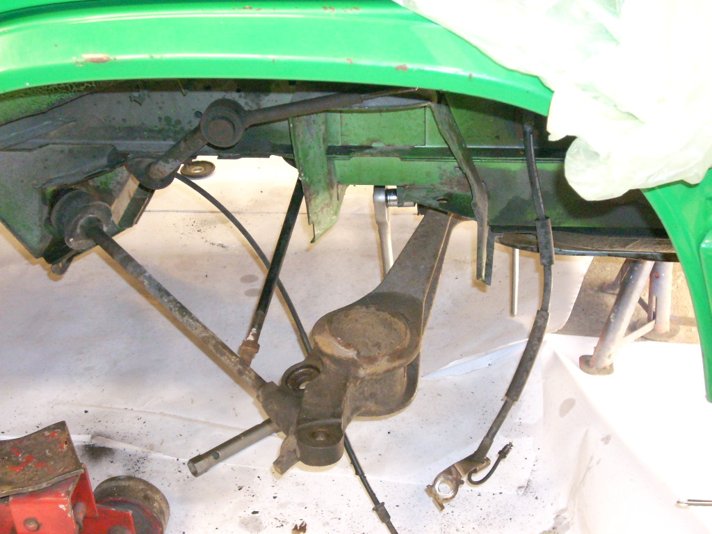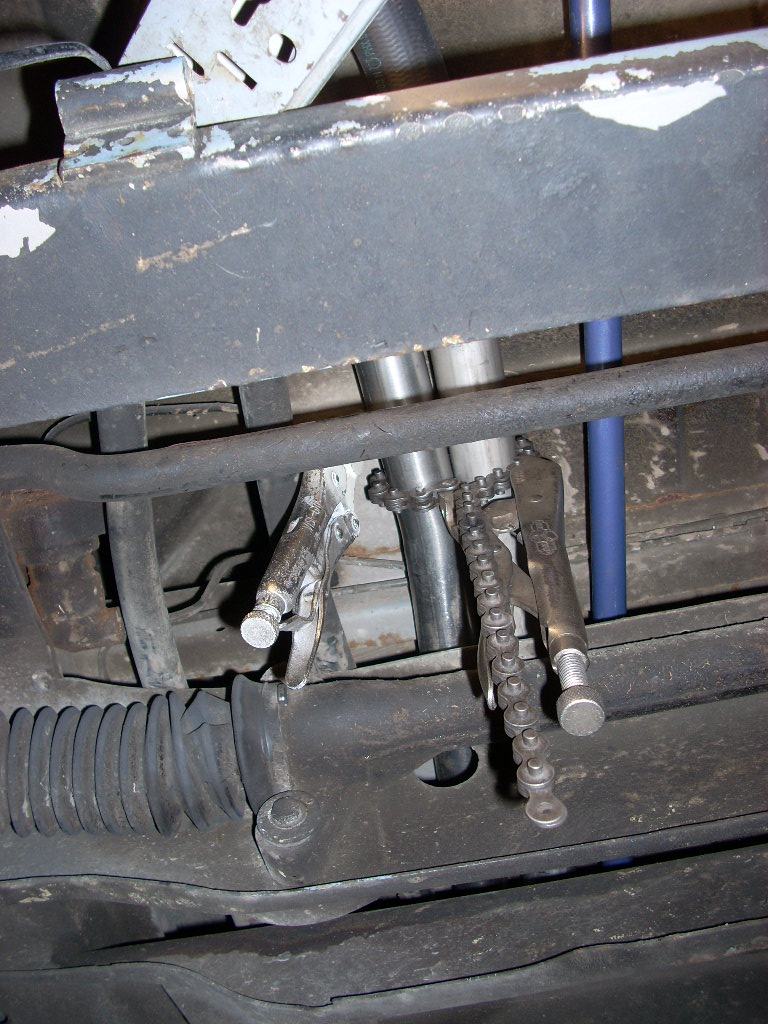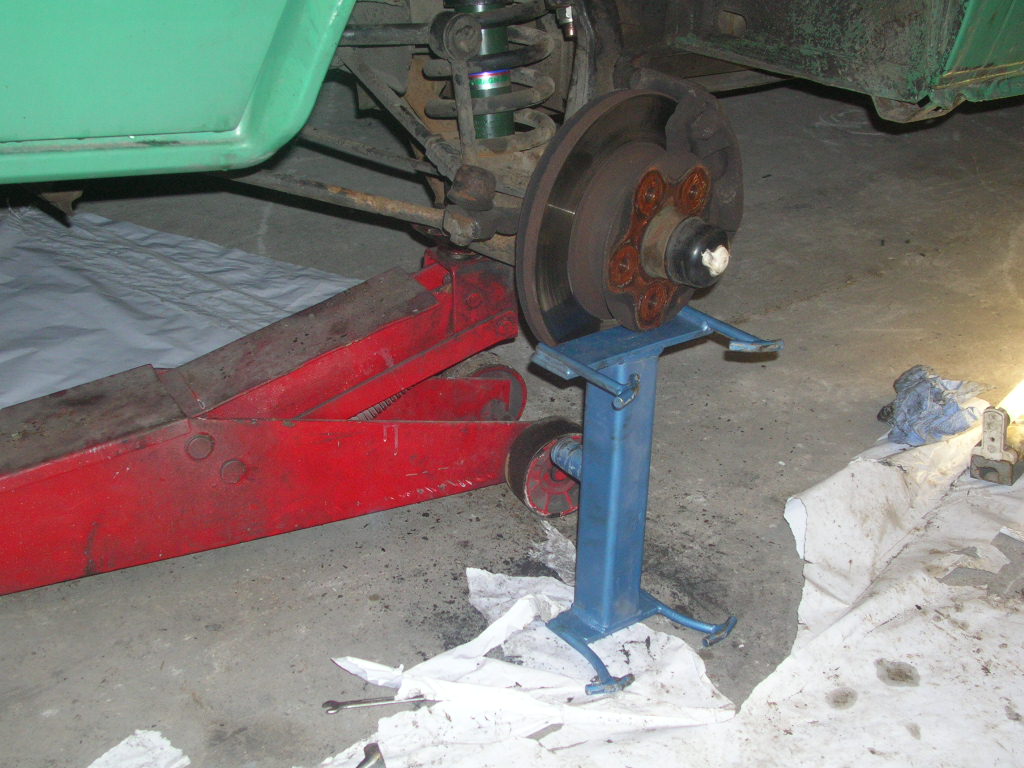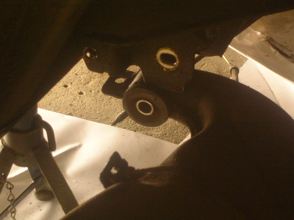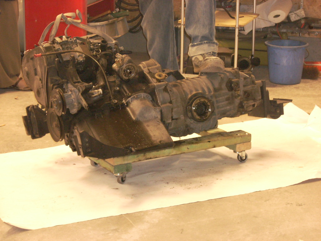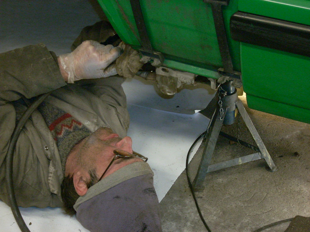 Zicht op de KY motor,welke hij met mijn verlengde krik liet zakken.Terug in zal de giraffe het werk wel doen.