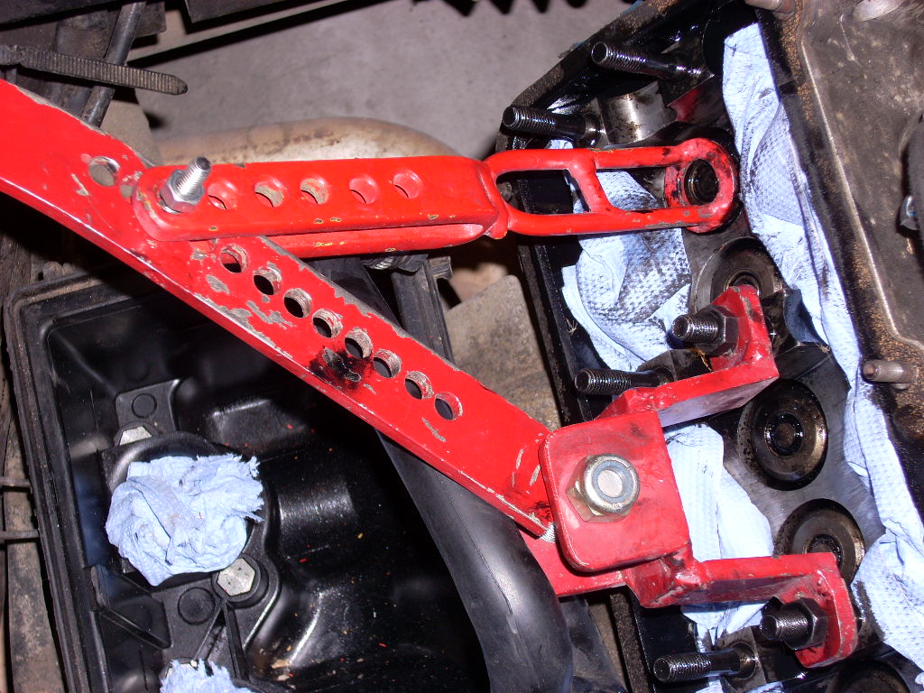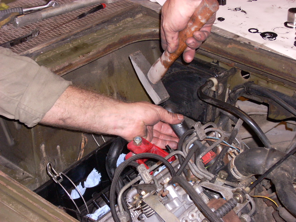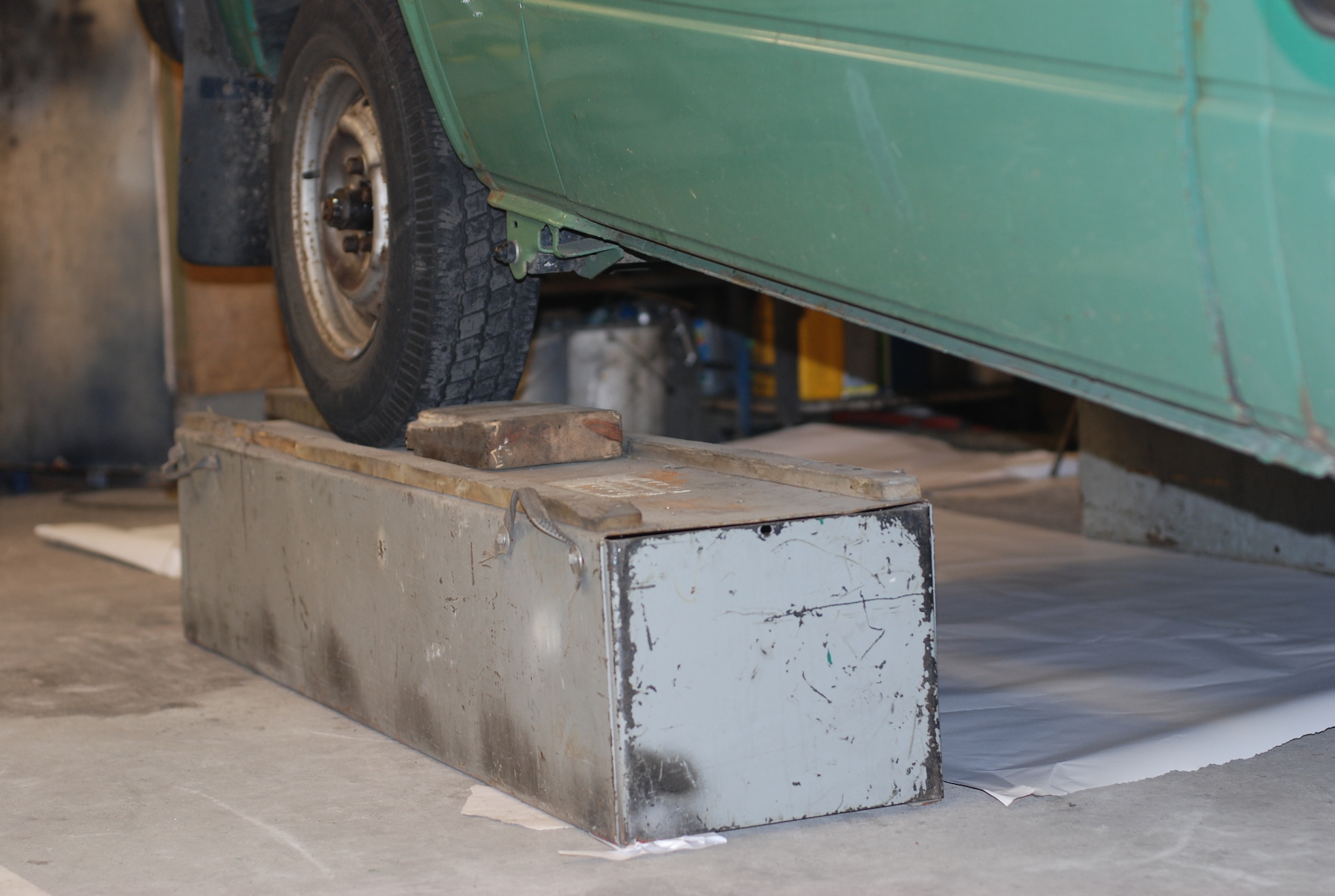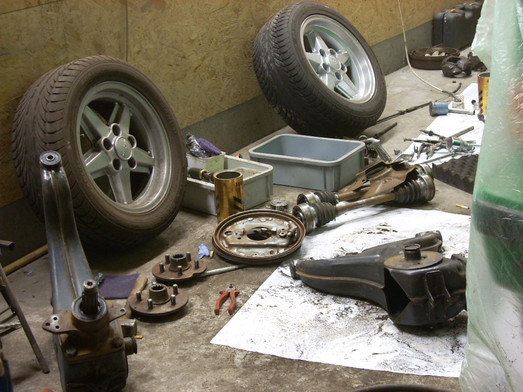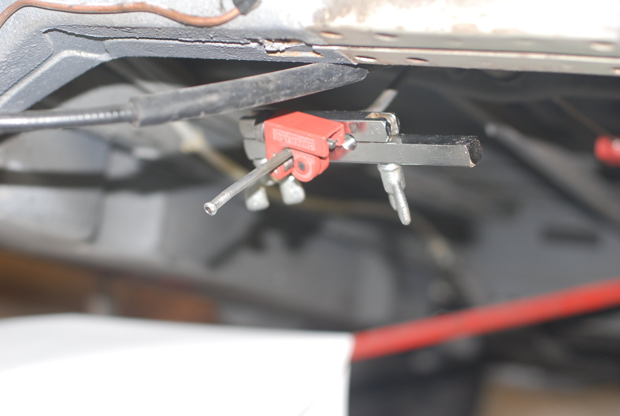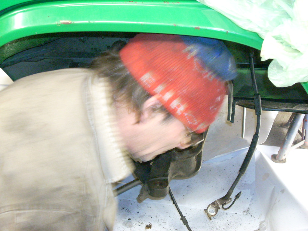 Zicht op de KY motor,welke hij met mijn verlengde krik liet zakken.Terug in zal de giraffe het werk wel doen.