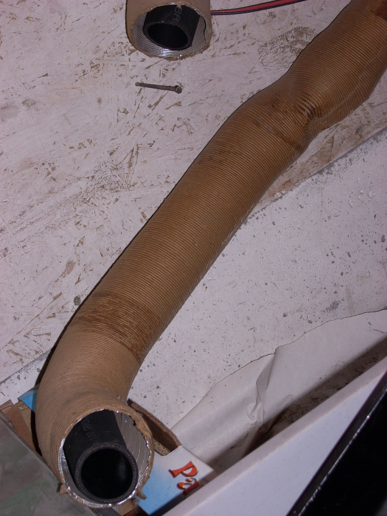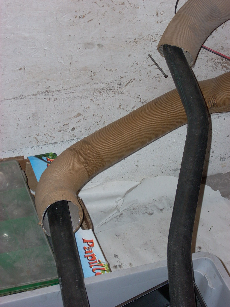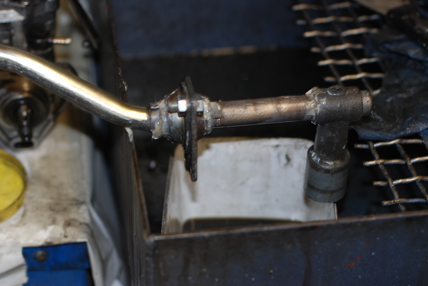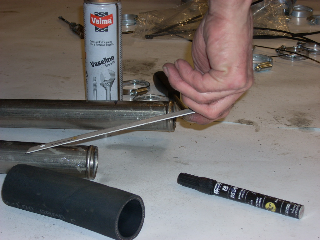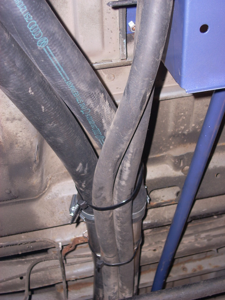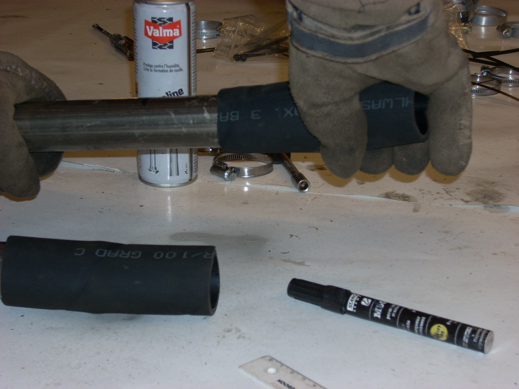 Zicht on de T3.Het korte buisje loopt door het chassis,beschermd door een rubber omhulsel.