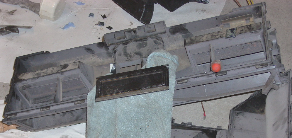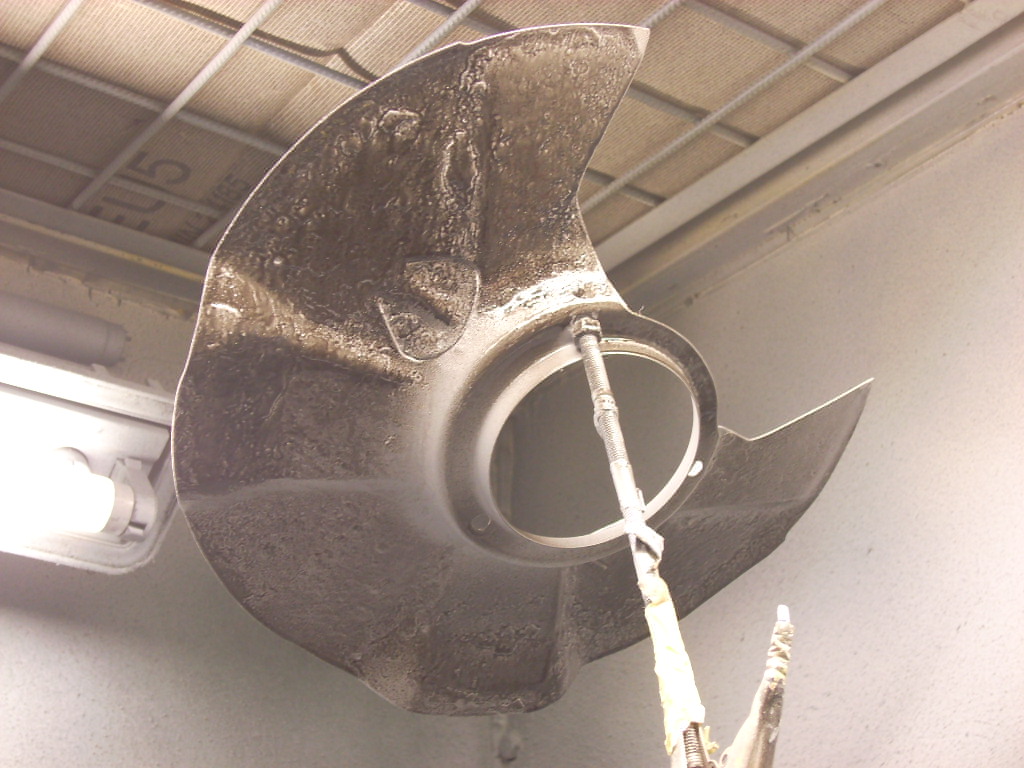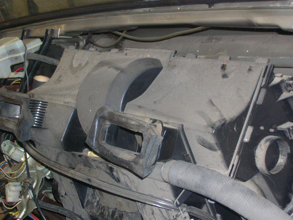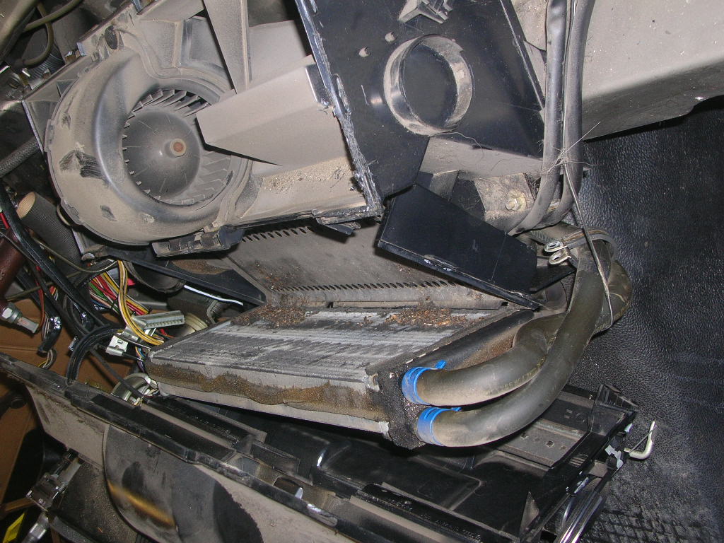 Zicht op 18 jaar stof. Dit stof doet de luchttoever verminderen,maar ook gaat het toerental van de ventilator stijgen,waardoor deze in de soepp kan draaien.Dus is het nodig dit vuil te verwijderen en de radiator door te blazen.