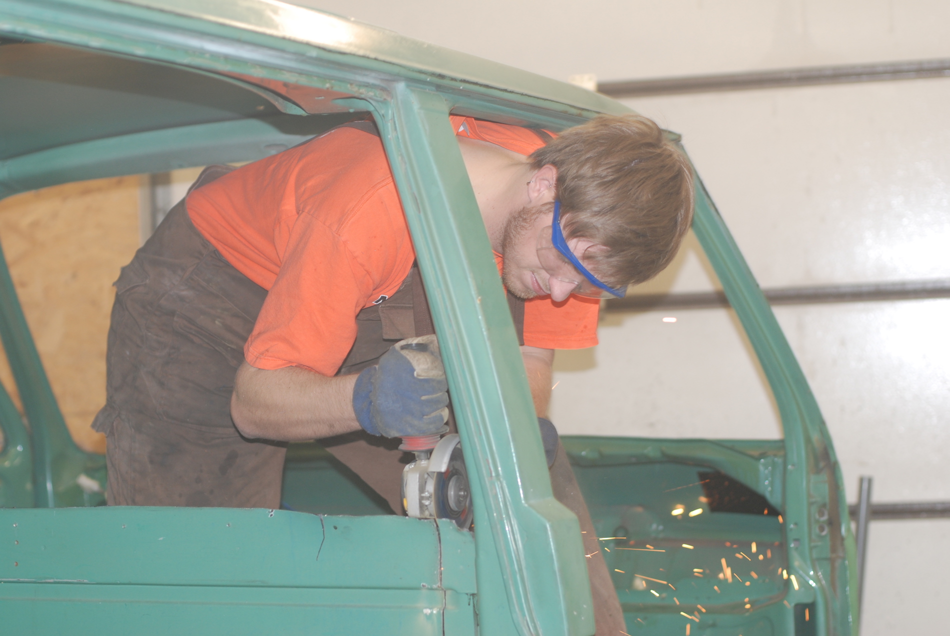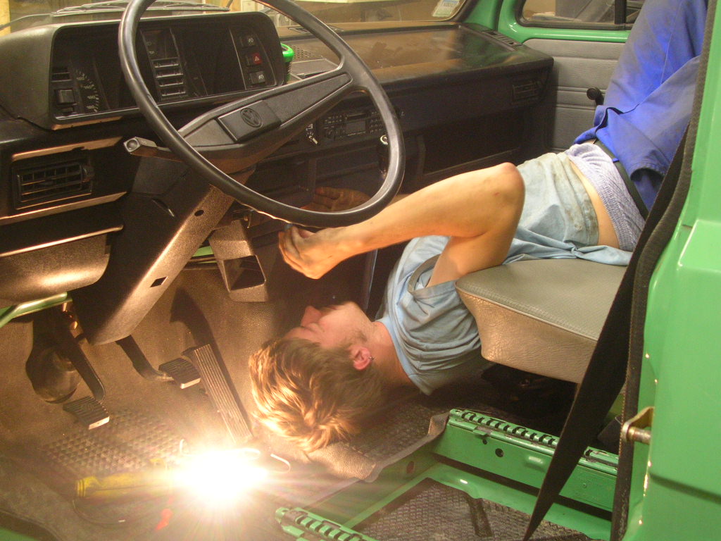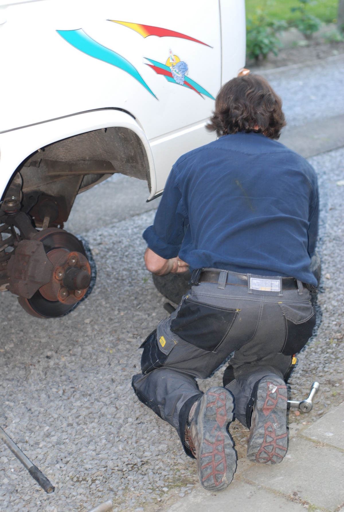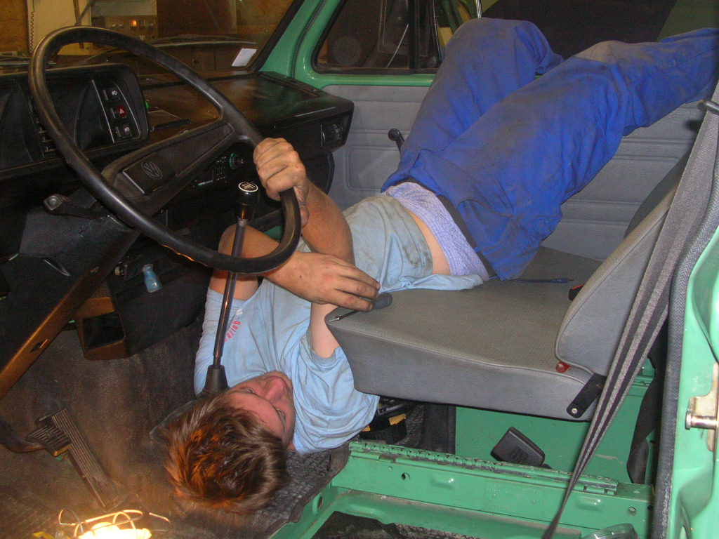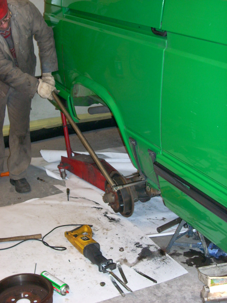 LeoM van het bus-forum maakte graag foto rapportages. Het laatste deel; LeoM T3 onderkantvernieuwing, deel 4. Waar Leo zijn werk laat controleren bij de uitlijning.