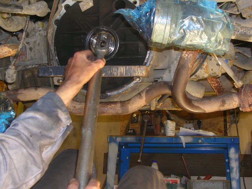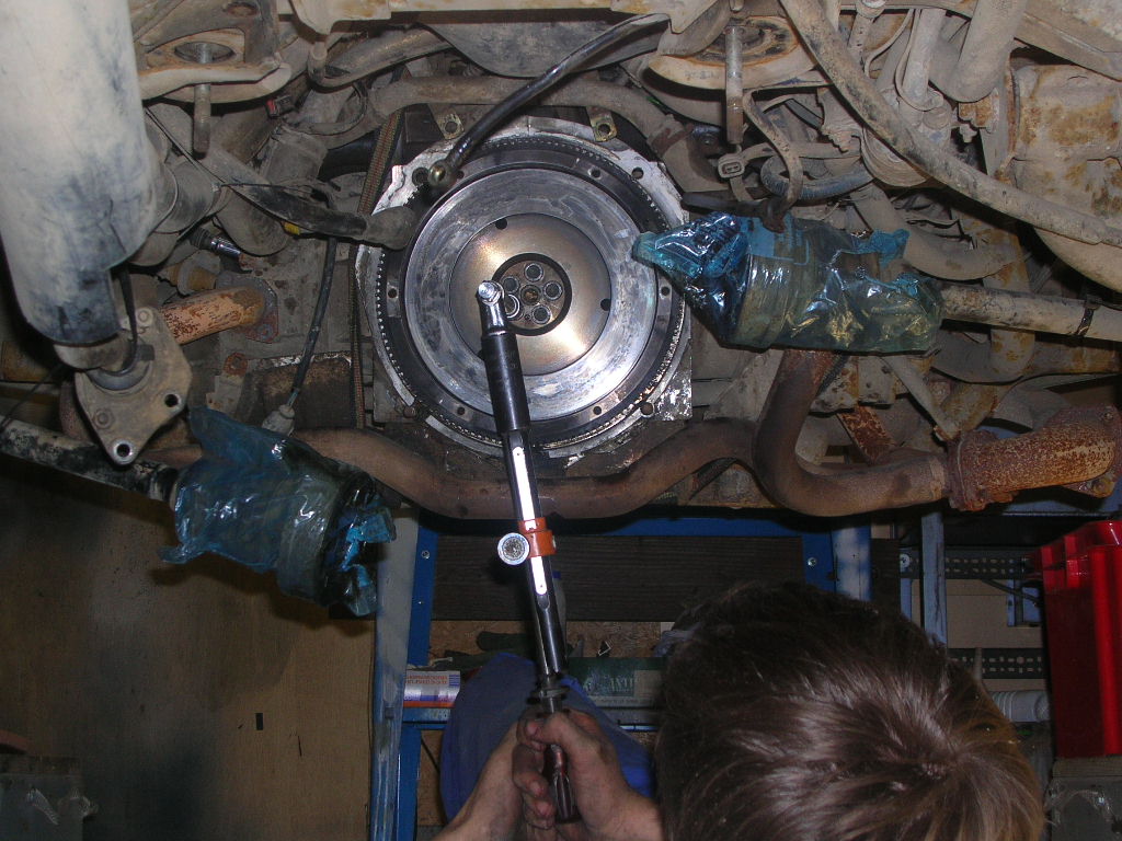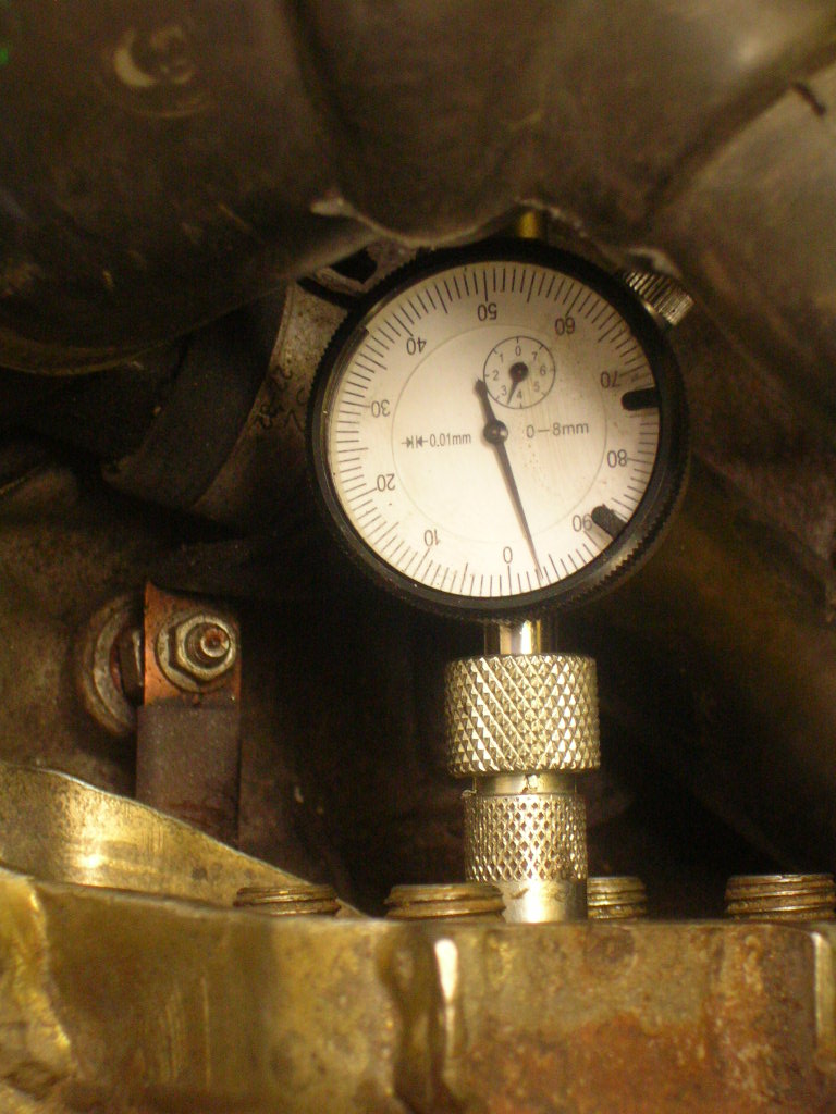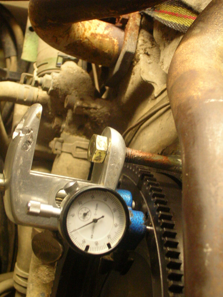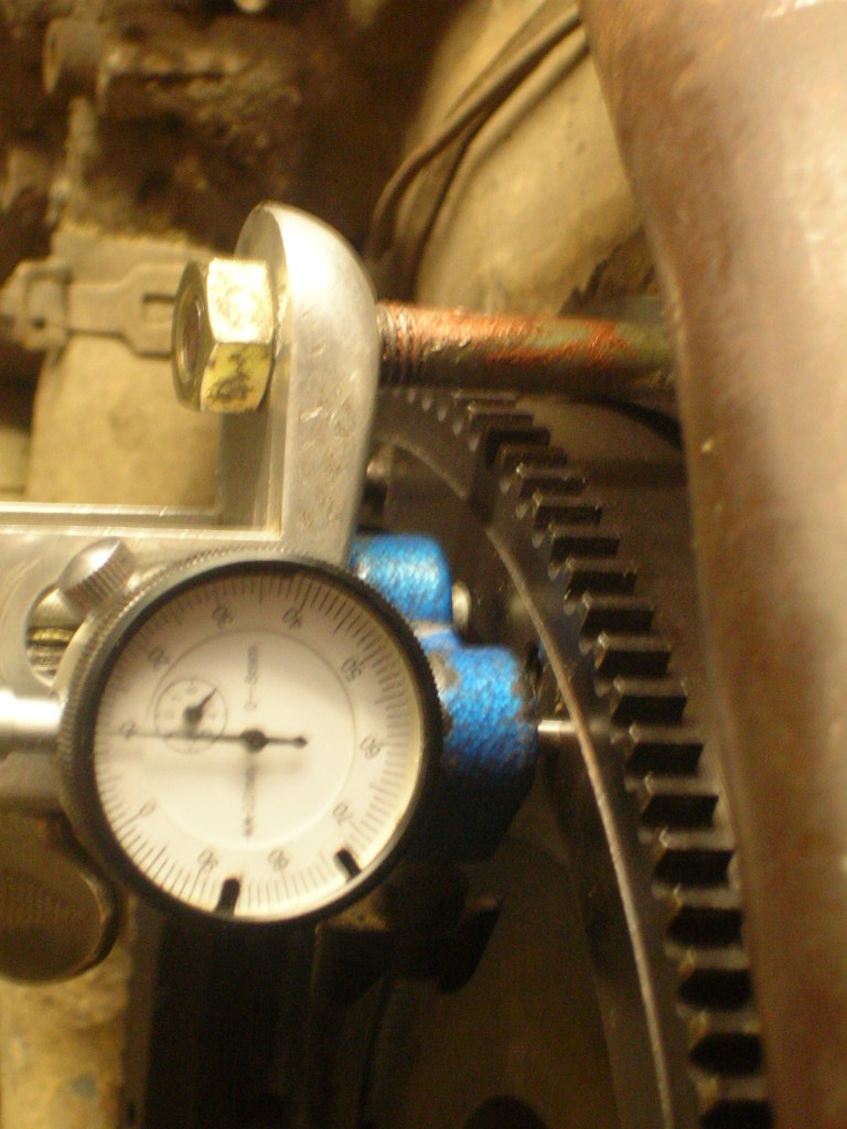 Het vliegwiel met nieuwe veiligheidsbouten vastzetten op juiste koppel.Om de speling te meten,kan het vliegwiel wel enkele keren vast en weer los moeten..Een echt sicuur geduldwerk.