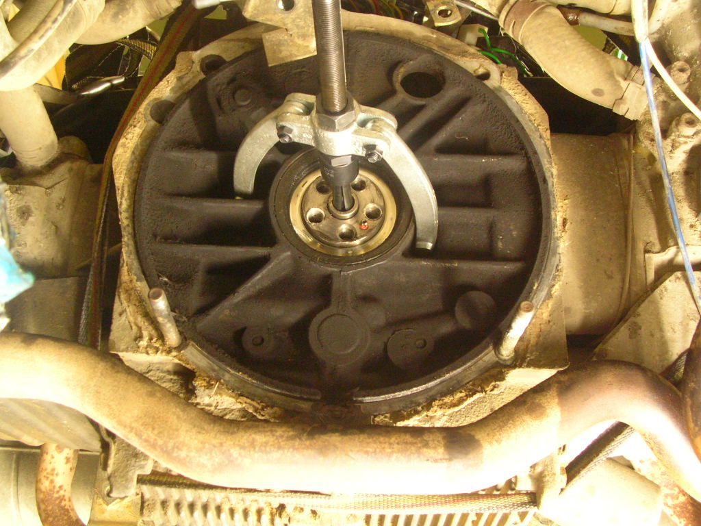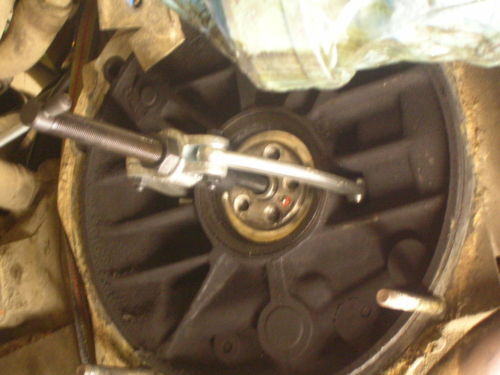 Om het naaldlager te kunnen verwijderen dient het vliegwiel te worden verwijderd.