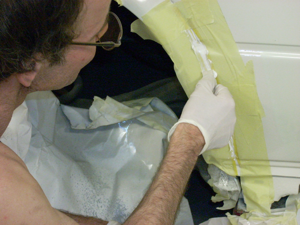 Na droging volgt een afplaksessie met heel speciale tape,om de lasnaden te kunnen dichten.