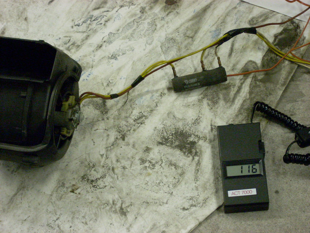 De temperatuur bedraagt 116°C,omdat de voorschakelweerstand hier niet gekoeld wordt door de blowerlucht.Toen begon het ding te roken en stopte ik de test.